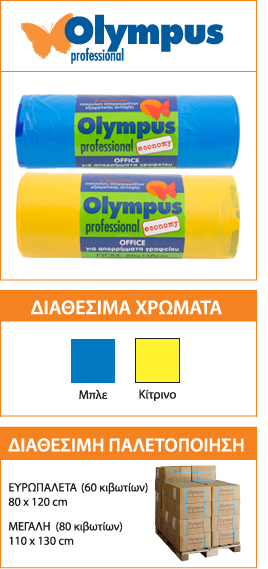 Οι σάκοι απορριμμάτων Olympus Professional χάρη στη μοναδική σύνθεσή τους περιέχουν έως και 50% λιγότερο πλαστικό. Έτσι αφήνουν το μικρότερο δυνατό οικολογικό αποτύπωμα, χωρίς να επηρεάζεται η αντοχή τους.