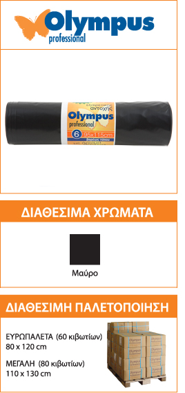 Οι σάκοι απορριμμάτων Olympus Professional χάρη στη μοναδική σύνθεσή τους περιέχουν έως και 50% λιγότερο πλαστικό. Έτσι αφήνουν το μικρότερο δυνατό οικολογικό αποτύπωμα, χωρίς να επηρεάζεται η αντοχή τους.
